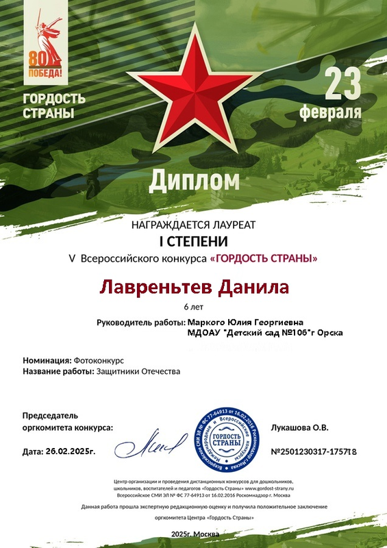 Всероссийский конкурс "Гордость страны", Диплом 1 степени, Лавреньтьев Данила