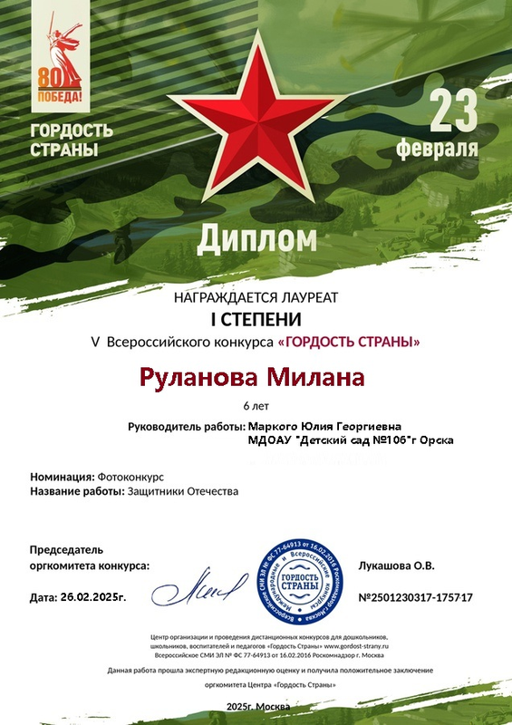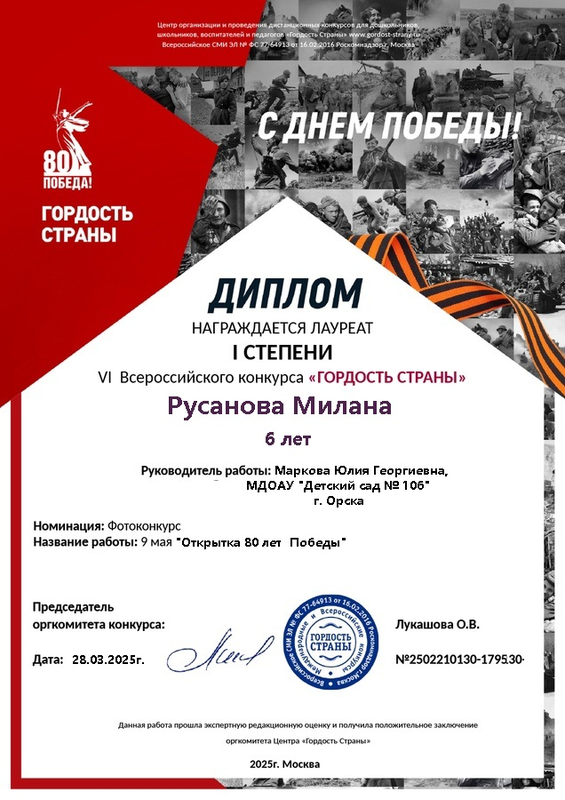 Всероссийский конкурс "Гордость страны", Диплом 1 степени, Русанова Милана