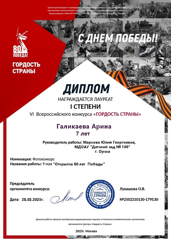 Всероссийский конкурс "Гордость страны", Диплом 1 степени, Галикаева Арина