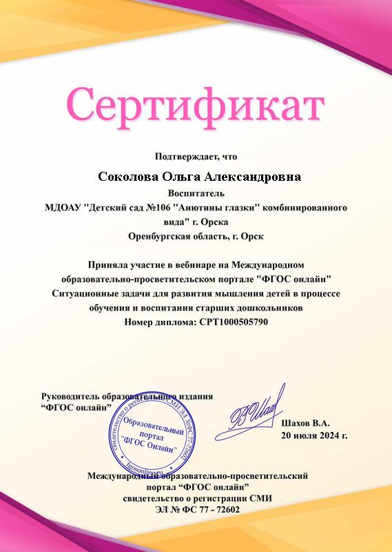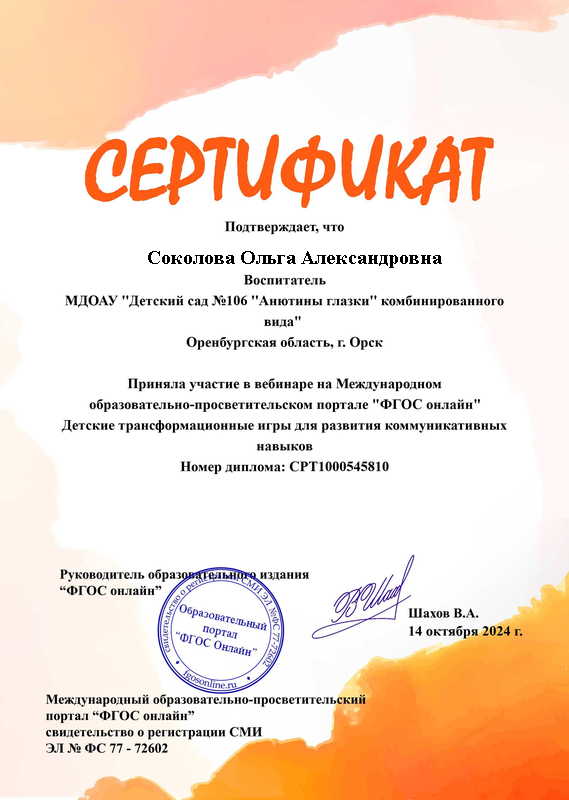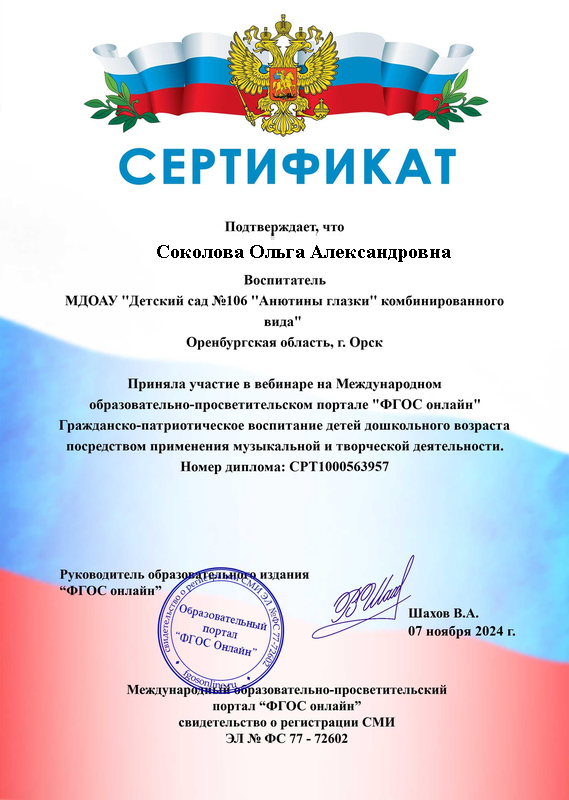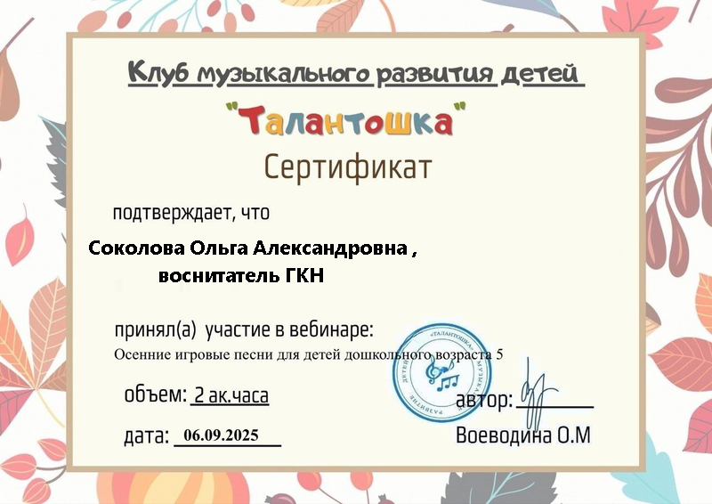 Сертификат участие в вебинаре: "Осенние игровые песни для детей дошкольного возраста