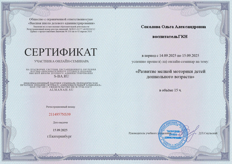 сертификат участника онлайн-семинара на тему «Развитие мелкой моторики детей дошкольного возраста» в объеме 15 часов. -