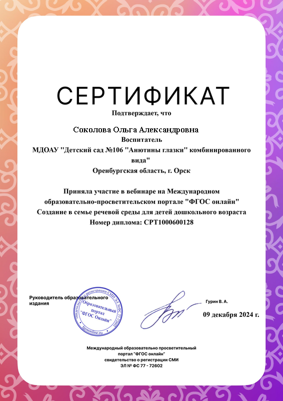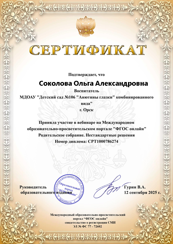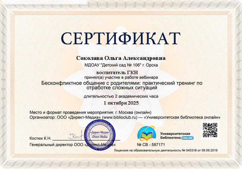 Сертификат участника вебинара «Бесконфликтное общение с родителями: практический тренинг по отработке сложных ситуаций». ООО «Директ - Медиа» от 01.10.2025 г. № СВ-587171